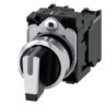 selector, iluminable, 22 mm, redondo, metal, brillante, blanco, selector, corto, 3 posiciones I-O-II, sostenido, ángulo de conmutación 2×45°, 10:30h/12h/13:30 h, con soporte, 1 NA, 1 NA, borne de tornillo